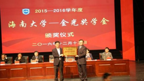 12月13日,2015-2016學年“海南大學-金光獎學金”頒發儀式在海南大學舉行,415名獲獎學生領取了金光獎學金。