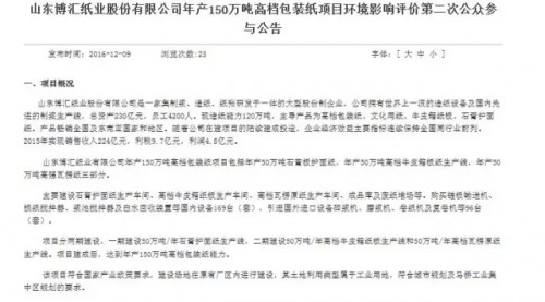 山東博匯紙業(yè)擬建150萬噸高檔包裝紙項目