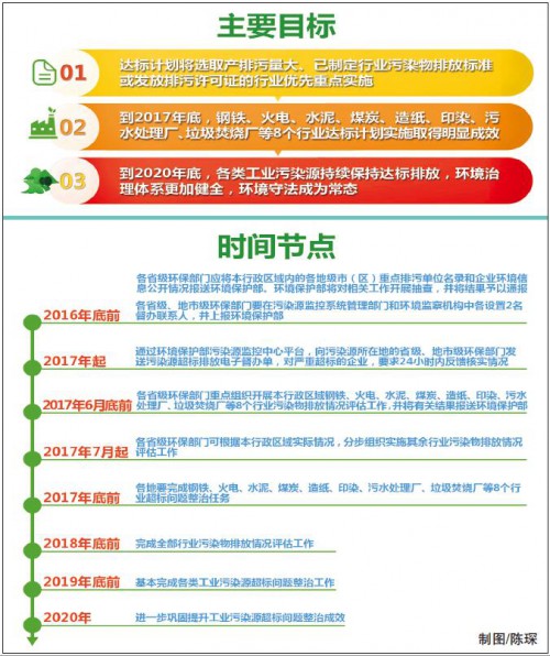 環(huán)境保護部日前發(fā)布《關(guān)于實施工業(yè)污染源全面達標排放計劃的通知》(以下簡稱《通知》),要求到2017年底,鋼鐵、火電、水泥、煤炭、造紙、印染、污水處理廠、垃圾焚燒廠等8個行業(yè)達標計劃實施取得明顯成效,污染物排放標準體系和環(huán)境監(jiān)管機制進一步完善,環(huán)境守法良好氛圍基本形成。到2020年底,各類工業(yè)污染源持續(xù)保持達標排放,環(huán)境治理體系更加健全,環(huán)境守法成為常態(tài)。