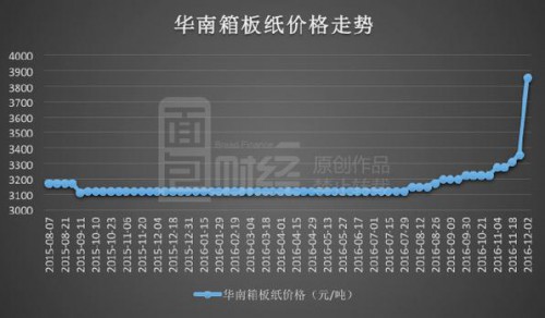 據(jù)統(tǒng)計(jì),截至2016年12月2號(hào),華南箱板紙價(jià)格為3858元/噸;與今年7月相比,增幅高達(dá)23.61%。下圖為面包財(cái)經(jīng)根據(jù)Wind數(shù)據(jù)繪制的華南箱板紙價(jià)格走勢(shì):