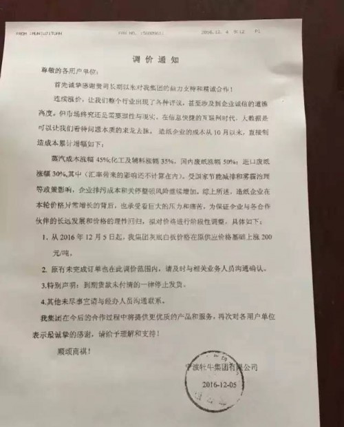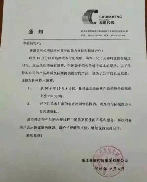 此外,據部分企業反映,有消息稱,明年1月初,杭州富陽市將提前落實節能減排任務,區域內的造紙企業的春節停機檢修計劃也將根據環保政策的要求隨時調整,可能提前至1月上旬進行。預計在12月末或1月初,紙廠還將有一輪階段性提價。