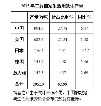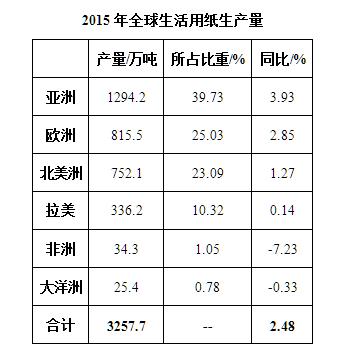2015年,世界經濟整體復蘇疲弱乏力,GDP僅增長2.47%,自2010年以來僅略高于2013年的增長水平。發達國家經濟復蘇緩慢,新興經濟體增速進一步回落,世界貿易增長依然疲弱,工業生產低迷。在上述宏觀經濟形勢下,2015年全球生活用紙生產量為3257.7萬噸,比2014年增長2.48%。具體數據如下: