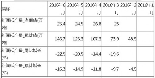據《2016-2020年中國新聞紙行業市場前景分析及行業調研報告》表明:2016年上半年我國新聞紙市場產量達146.7萬噸,累計下降16.3%。