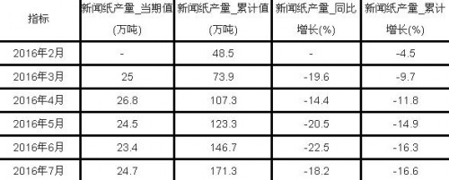 2016年1-7月全國新聞紙產量統(tǒng)計表