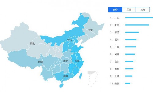 目前,全國共有印刷企業(yè)10多萬家,從業(yè)人員340多萬人,全行業(yè)資產(chǎn)總額近1.1萬億元。從百度搜索指數(shù)來看,印刷企業(yè)主要分布于華東、華北、華 南三大區(qū)域,且多數(shù)企業(yè)主要集中于廣東、北京、浙江、四川、江蘇、河南、山東、河北等省市。由區(qū)域分布圖可知,中國印刷業(yè)橫跨南北,由東向西逐漸呈現(xiàn)半包 圍式發(fā)展趨勢。