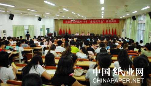 張鎮(zhèn)寰助理在致辭中,對(duì)獲得“金光獎(jiǎng)學(xué)金”的同學(xué)們表示祝賀,希望同學(xué)們?cè)俳釉賲枺W(xué)習(xí),回報(bào)社會(huì)。學(xué)校領(lǐng)導(dǎo)和張鎮(zhèn)寰助理共同為獲得2015年度“金光獎(jiǎng)學(xué)金”的學(xué)生代表頒獎(jiǎng)。瓊臺(tái)師范校長(zhǎng)程立生在致辭中指出,金海漿紙是有社會(huì)責(zé)任和擔(dān)當(dāng)?shù)钠髽I(yè),公司以“支持海南教育、保護(hù)海南環(huán)境、促進(jìn)海南社會(huì)和諧發(fā)展”為宗旨,在促進(jìn)我校青年學(xué)子成才和繁榮校園文化等方面發(fā)揮了重要作用。他對(duì)金海漿紙支持教育、回饋社會(huì)的善舉表示敬意和衷心感謝。