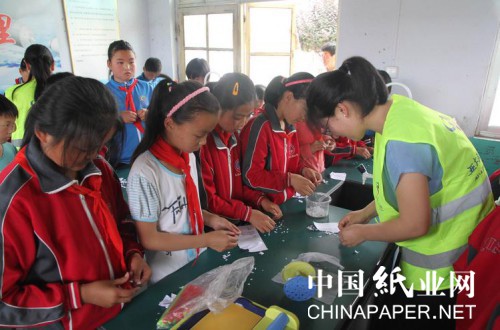 活動中,志愿者根據“我是小小造紙家”教程方案,帶領孩子們從中國古代四大發明,講到我國古代造紙技術的演變歷程,到現代造紙工業清潔生產的現狀及環境保護的重要性。孩子們求知的渴望,略顯羞澀的眼神,飽滿的熱情,打動著志愿者們。志愿者們盡自己最大努力,讓這些對 “工業、環保”接觸不多的孩子們,更多的掌握關于四大發明之一的造紙術、工業以及環保的有關知識,讓他們親身體驗一次“我是小小造紙家”。