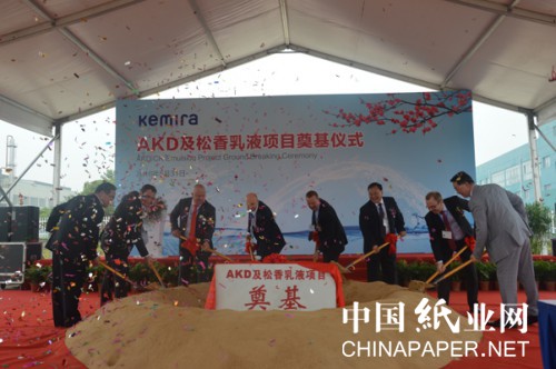 全球領先的化學品公司凱米拉(Kemira)5月31日在其南京工廠內為兩條新投建的—萬噸級AKD及松香乳液項目舉行了正式的奠基儀式。芬蘭駐滬總領事萬伯陽(Jan Wahlberg)先生,凱米拉全球紙漿和造紙部及亞太區總裁金寶森(Kim Poulsen)先生,及南京市化工園區領導諸淵深先生等共同出席了此次奠基活動。