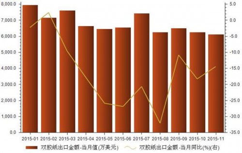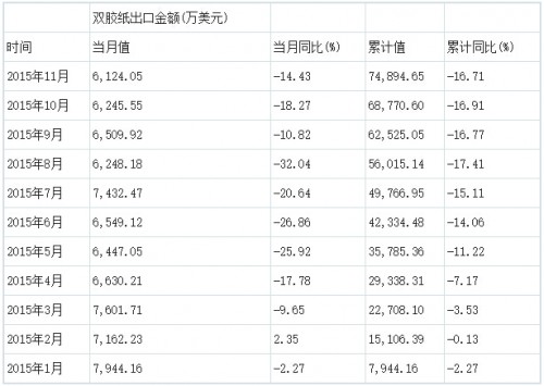 2015年11月我國雙膠紙出口金額同比下降14.43%