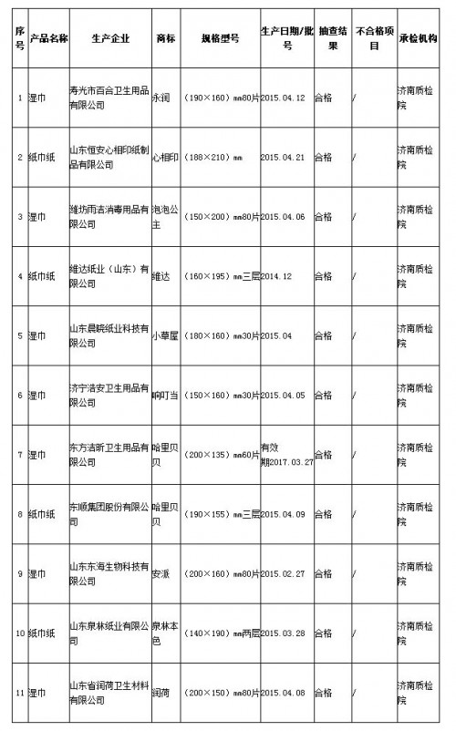 核心提示:28日從山東省質(zhì)量技術(shù)監(jiān)督局官網(wǎng)獲悉,該局于2015年第2季度組織開展了兒童紙巾紙、濕巾產(chǎn)品質(zhì)量省監(jiān)督抽查,共抽查了全省11家企業(yè)生產(chǎn)的11批次產(chǎn)品,全部合格。