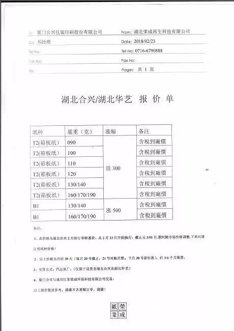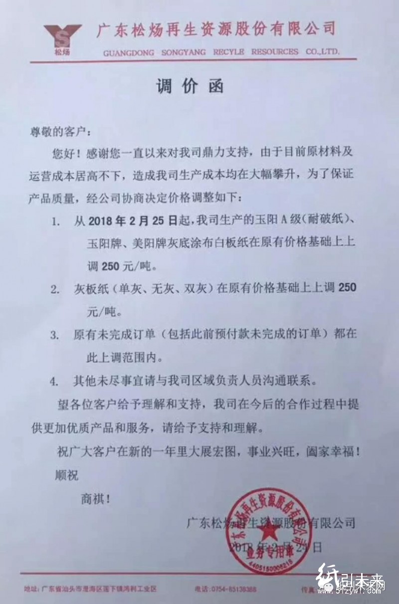 1、2018年2月25日起,我司生產的玉陽A級(耐破紙)、玉陽牌、美陽牌灰底涂布白板紙在原價格基礎上調250元/噸;