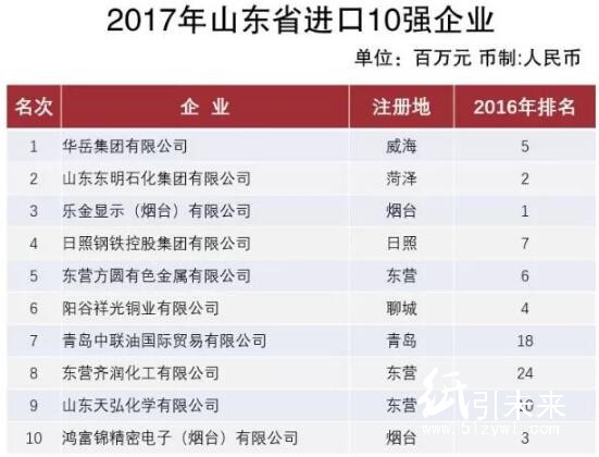 在進口100強企業中,共有6家企業入選,分別是亞太森博(山東)漿紙有限公司(第27位)、山東太陽紙業股份有限公司(第49位)、山東華泰紙業股份有限公司(第84位)、壽光美倫紙業有限責任公司(第91位)、山東晨鳴紙業集團股份有限公司(第94位)和山東國際紙業太陽紙板有限公司(第98位)。