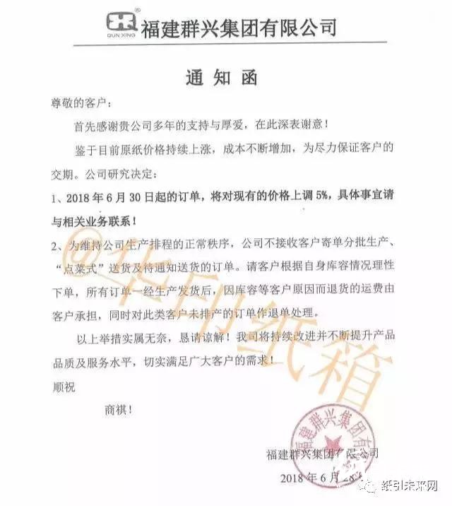 6月28日,福建規模紙板企業群興集團發布漲價函,宣布自6月30日起價格上調5%。公司不接收客戶寄單分批生產,“點菜式”送貨及待通知送貨訂單。而6月份福建紙板市場行情并不樂觀,臨近月底終于開始好轉。晉江市群英包裝有限公司是福建省規模較大的成品紙生產加工企業。在4月底、5月初的成品紙漲價中,該公司也多次上調紙板價格。但6月上半月,該公司卻累計下調紙板價格約16.7%。紙板價格從最高價格每平方米3元,下調到了2.5元左右。而紙板價格的漲漲跌跌都是受到下游需求變化的影響。需求好轉了,價格也就上來了。