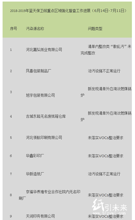 2018-2019年藍天保衛(wèi)戰(zhàn)重點區(qū)域強化督查工作持續(xù)開展,200個督查組按照工作方案要求,對京津冀及周邊地區(qū)206個縣(市、區(qū))進行督查,小編整理了環(huán)保部通報的問題企業(yè),自6月14日至7月11日近一個月的時間內(nèi),環(huán)保部發(fā)現(xiàn)51家造紙、印刷、包裝企業(yè)有環(huán)境問題,具體情況如下表。