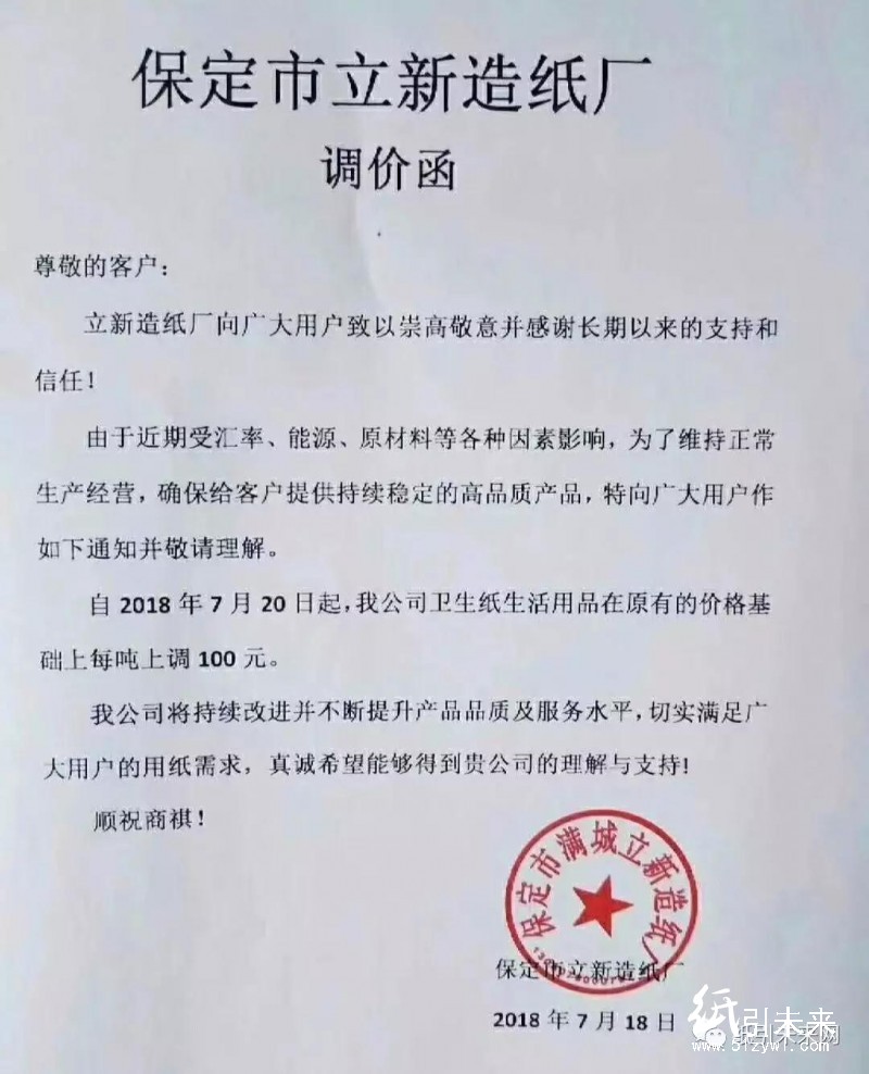 保定立發(fā)紙業(yè)有限公司:由于近期受匯率、能源、原材料等各種因素影響,自2018年7月20日起,我公司衛(wèi)生紙生活用品在原有的價格基礎上每噸上調(diào)100元。