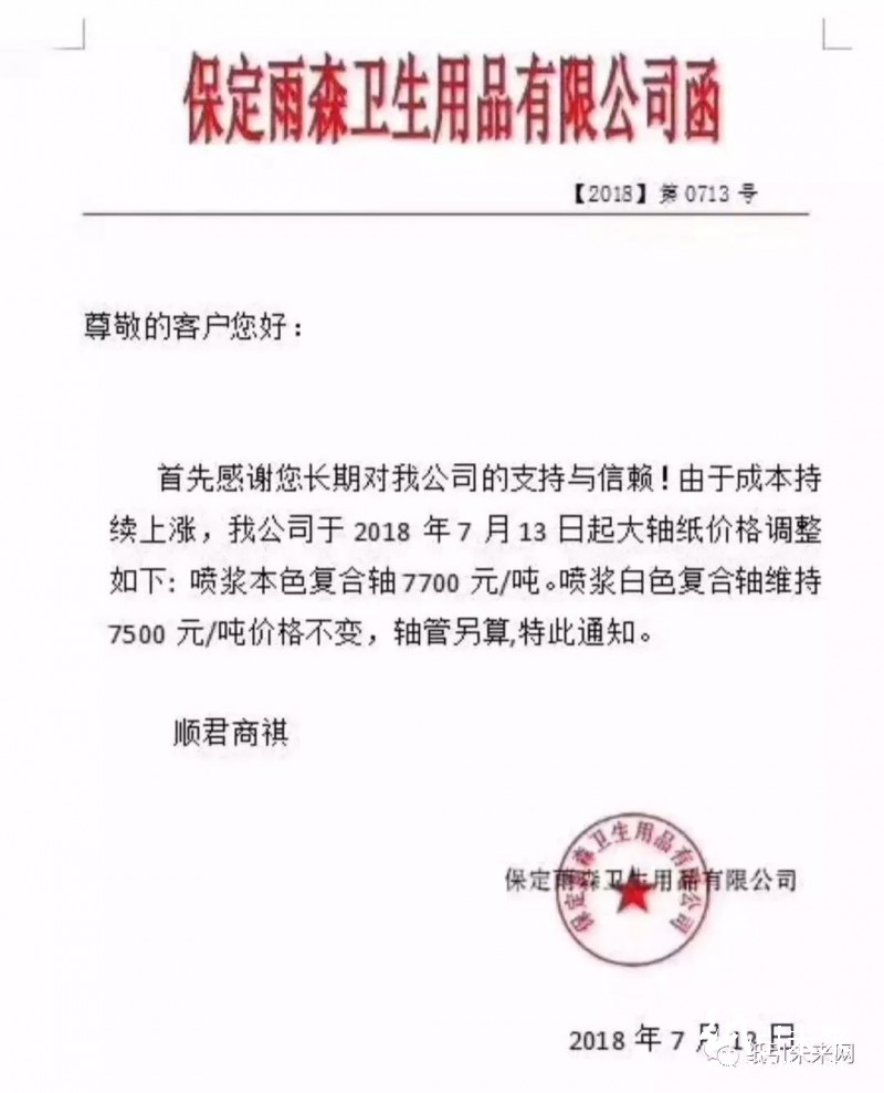 保定雨森衛(wèi)生用口有限公司:由于成本持續(xù)上漲,我公司于2018年7月13日 起大軸紙價格調(diào)整如下:噴漿本色復合軸7700元/噸。噴漿白色復合軸維持7500元/噸價格不變,軸管另算,特此通知。