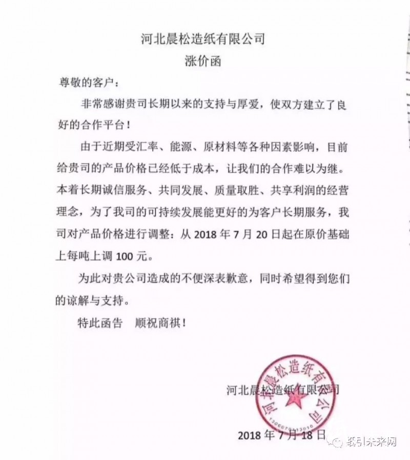 保定市富民紙業(yè)有限公司:由于原材料及其他綜合成本不斷上漲,從2018年7月20日起軸紙、盤紙出廠價在原銷售價格的基礎上每噸上調(diào)100元。