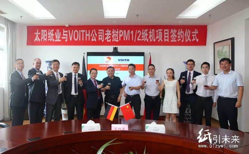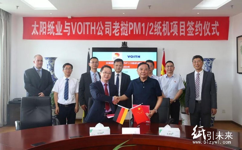 紙引未來網訊 近日,太陽紙業與VOITH公司就老撾PM1/2紙機項目舉行簽約儀式。福伊特造紙亞洲區總裁喻致兵,福伊特亞洲區銷售副總裁程波,太陽紙業董事長李洪信,副總經理、總工程師應廣東,包裝紙事業部總監付國伶及項目相關人員出席簽約儀式。