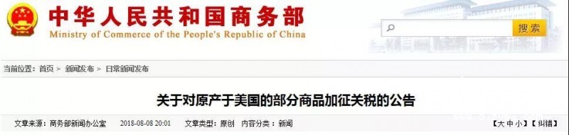 紙引未來網訊 8月8日晚,商務部發布《關于對原產于美國的部分商品加征關稅的公告》,根據商務部2018年第55號公告和《國務院關稅稅則委員會關于對原產于美國約160億美元進口商品加征關稅的公告》(稅委會公告〔2018〕7號),公布經調整的對美國輸華商品加征關稅商品清單二,自2018年8月23日12時01分起實施加征25%關稅。