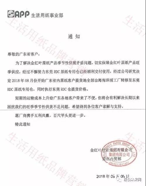 APP生活用紙事業部:為了解決金紅葉原紙產品季節性供需矛盾問題,切實保障金紅葉原紙產品旺季供應,執行東莞RDC倉提貨價格。
