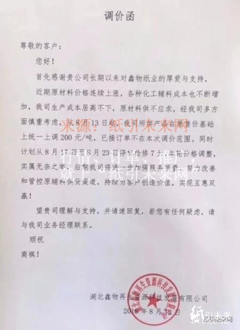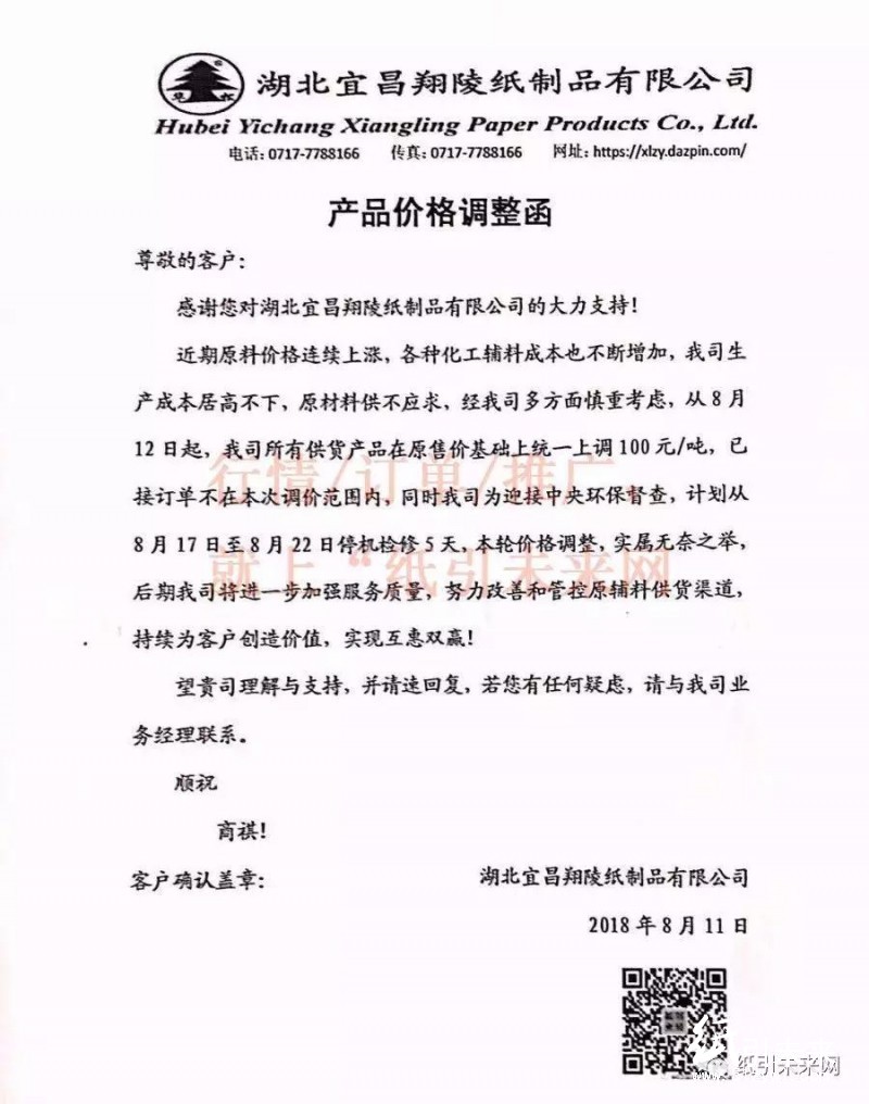 湖北宜昌翔陵紙制品有限公司:近期原料價格連續上漲,各種化工輔料成本也在不斷增加,從8月12日起我司所有供貨產品在原售價基礎上統一上調100元/噸。計劃從8月17日至8月22日停機檢修5天。