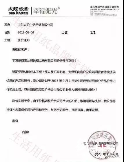 山東太陽生活用紙有限公司:近期受原材料成本不斷上漲及匯率影響,為保證客戶及終端消費者持續提供優質的產品和服務,公司計劃于2018年9月1日對生活用紙成品部分產品進行相應上調。
