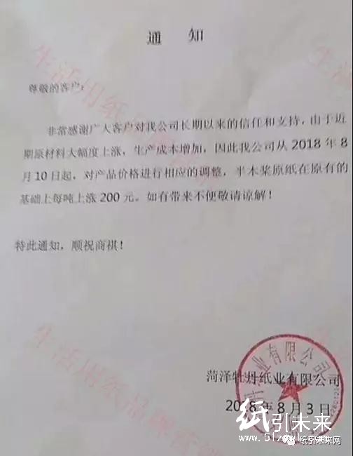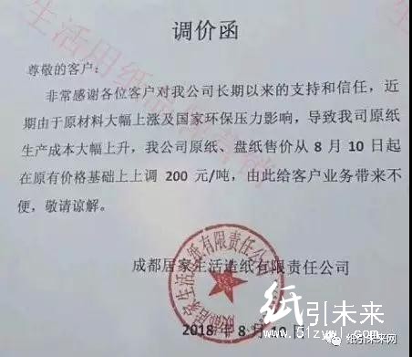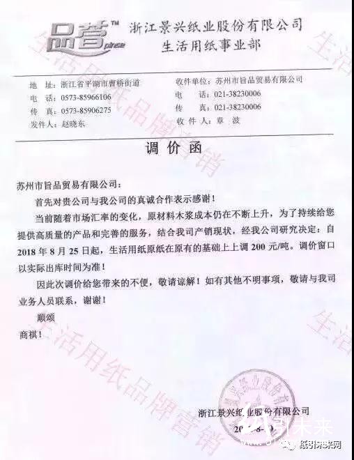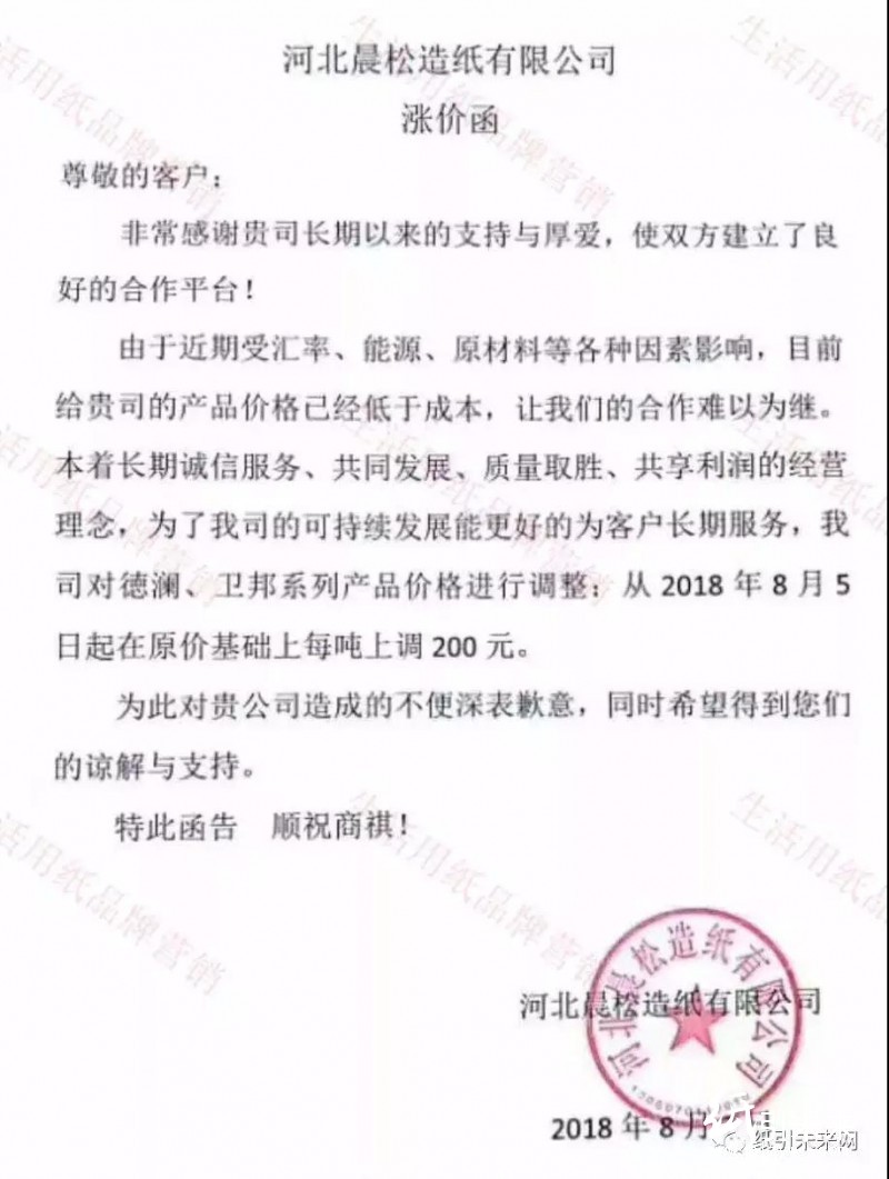 浙江景興紙業股份有限公司:因市場匯率變化、原材料木漿成本仍不斷上升,自2018年8月25日起,生活用紙原紙在原有基礎上上調200元/噸。