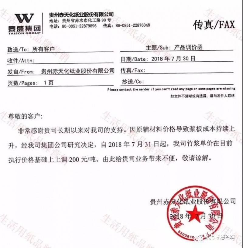 貴州赤天化紙業有限公司:因原輔材料價格導致漿板成本持續上升,經公司決定,自2018年7月31日起,我司竹漿單價在目前基礎上上調200元/噸。
