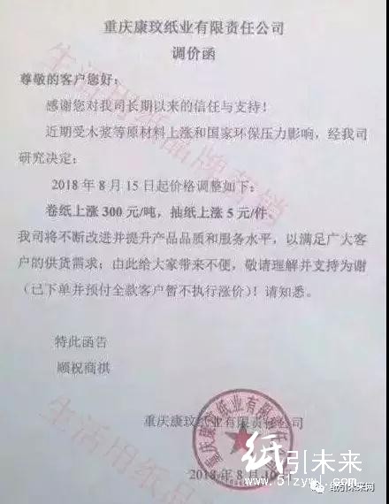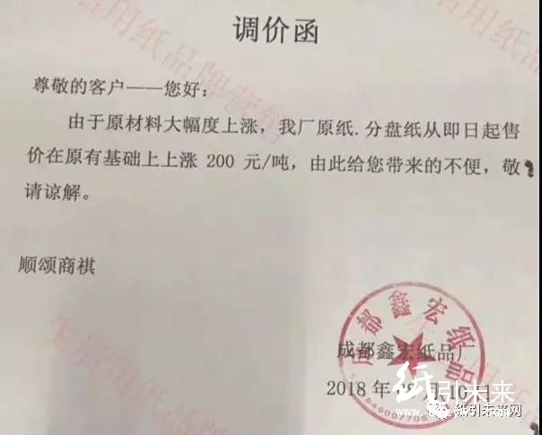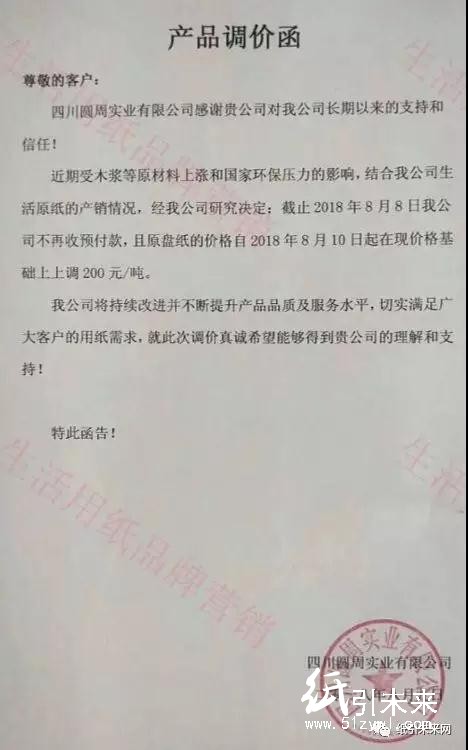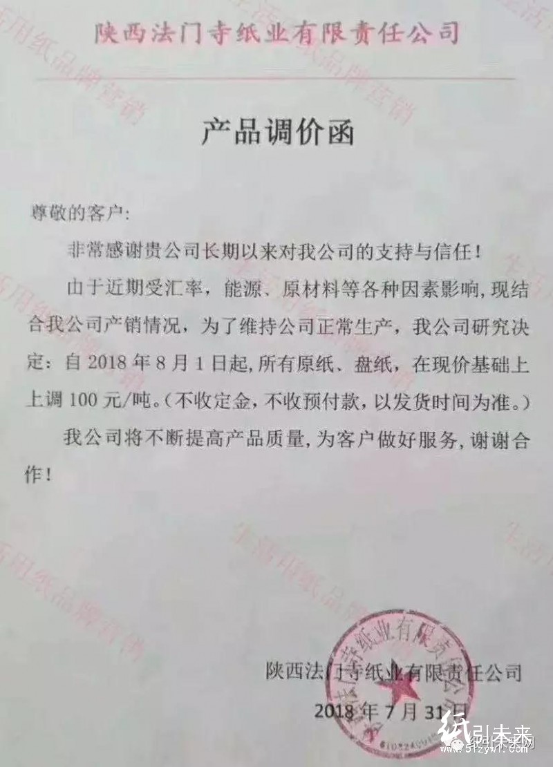 陜西法門寺紙業有限責任公司:由于近期受匯率、能源、原材料等因素影響,為了維持正常生產,公司決定:自2018年8月1日起,所有原紙、盤紙,在現有價格上上調100元/噸。