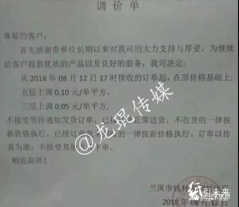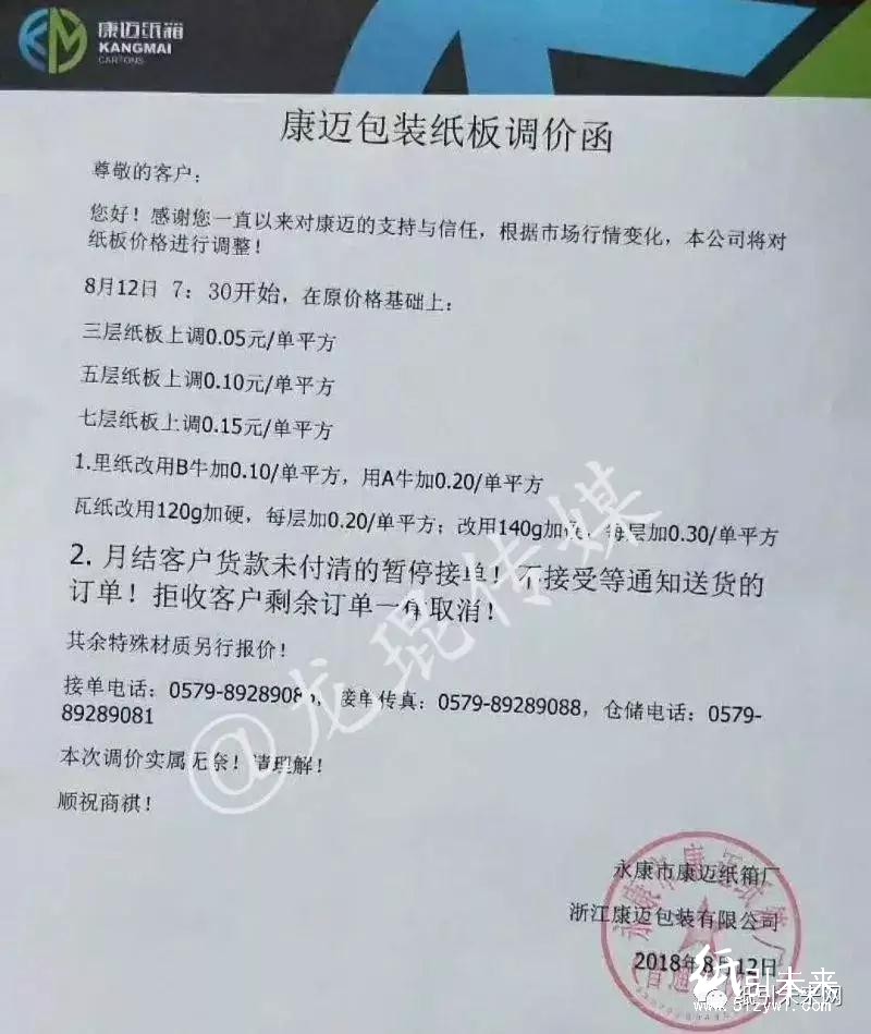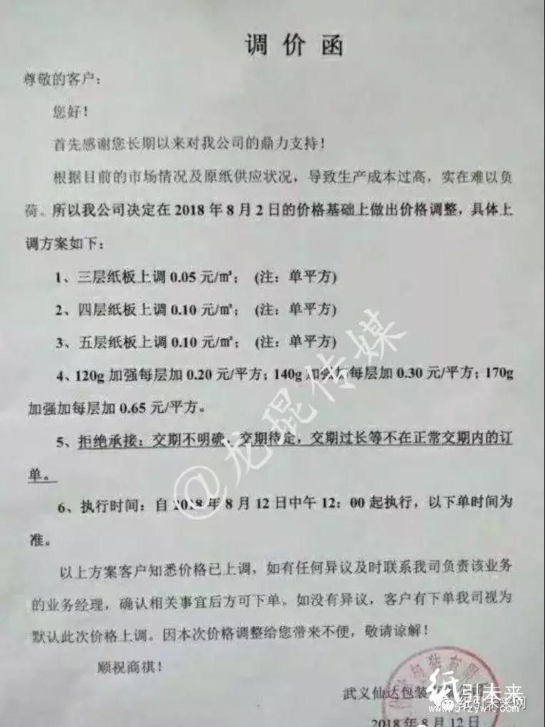 武義仙達包裝有限公司:自2018年8月12日中午12點起,三層紙板上調0.05元/平方,四層紙板上調0.10元/平方,五層紙板上調0.10元/平方(注:單平方)。