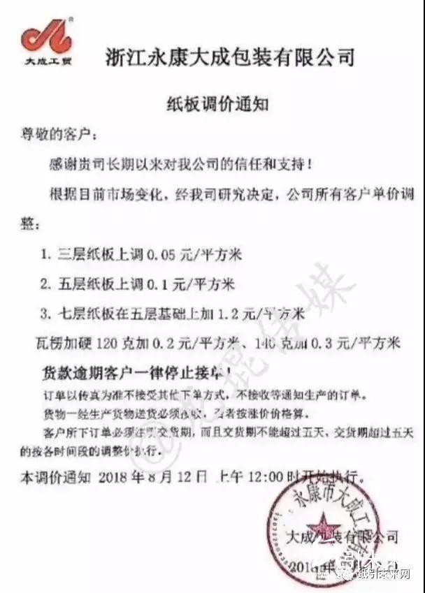 浙江永康大成包裝有限公司:自2018年8月12日中午12點起,三層紙板上調0.05元/平方,五層紙板上調0.10元/平方,七層紙板在五層基礎上加1.2元/平方。