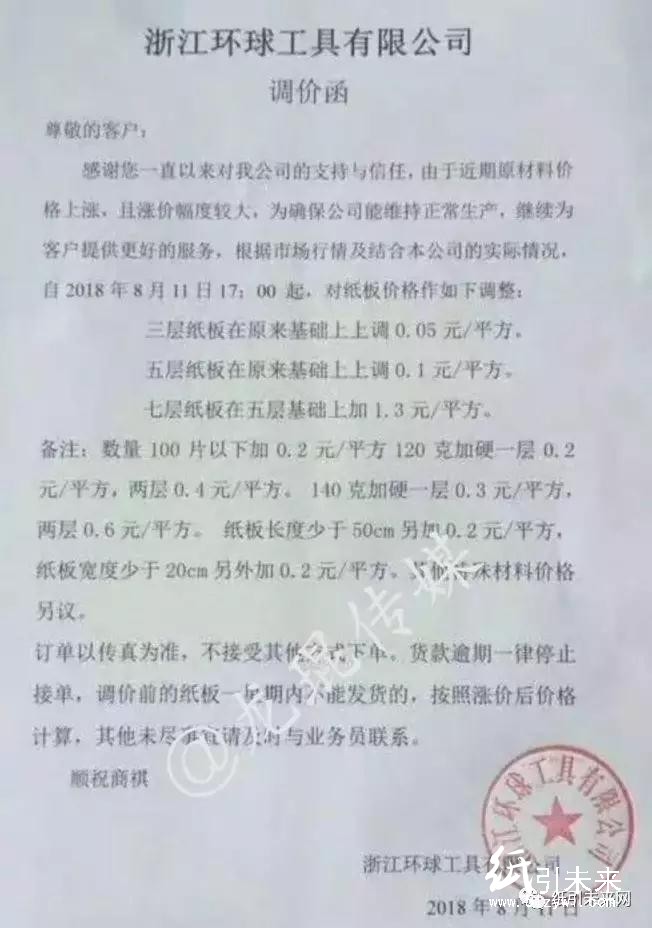 浙江環球工具有限公司:自2018年8月11日17:00起,三層紙板上調0.05元/平方,五層紙板上調0.10元/平方,七層紙板在五層基礎上加1.3元/平方。