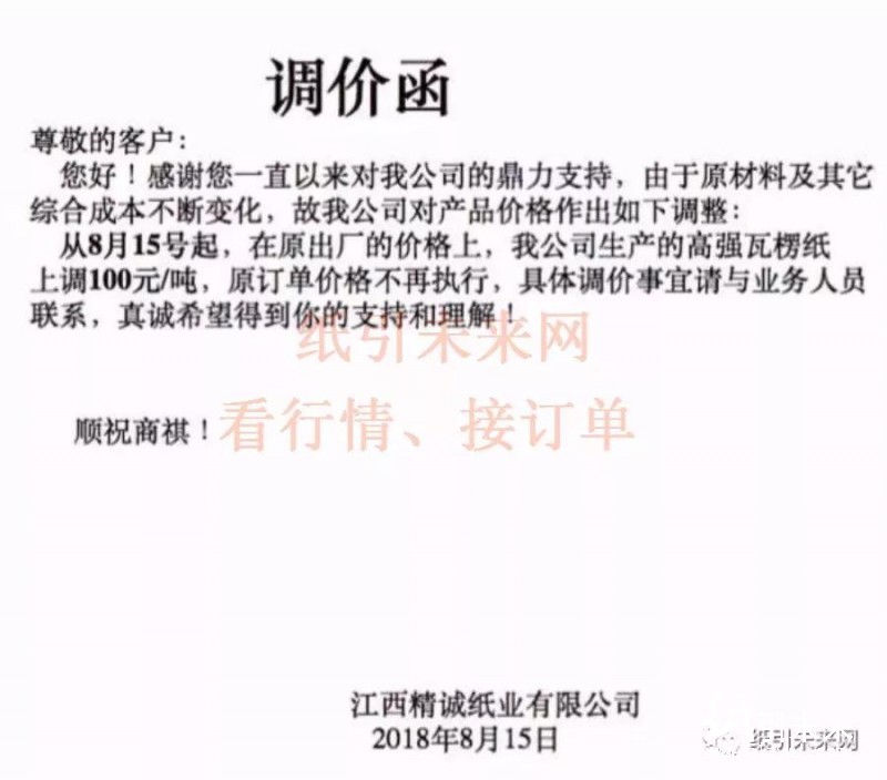 江西精誠紙業有限公司:由于原材料及其它綜合成本不斷變化,從8月15日起,在原出廠的價格上,我公司生產的高強瓦楞紙上調100元/噸。