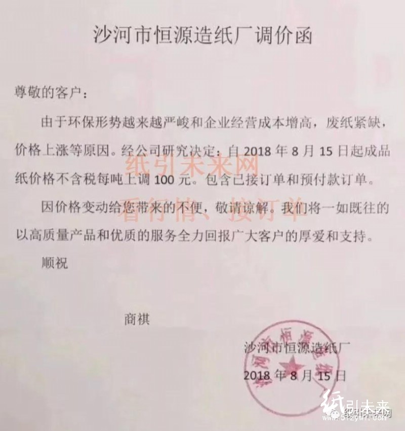 沙河市恒源造紙廠:由于環保形勢越來越嚴峻和企業經營成本增高,廢紙緊缺,價格上漲等原因,自2018年8月15日起成品紙價格不含稅每噸上調100元。
