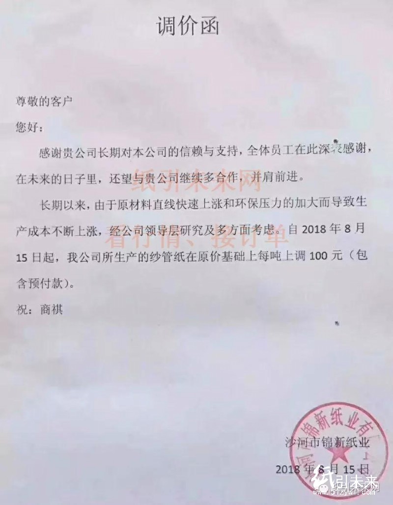 沙河市錦新紙業:由于原材料直線快速上漲和環保壓力的加大而導致生產成本不斷上漲,自2018年8月15日起,我司所生產的紗管紙在原價基礎上每噸上調100元(包含預付款)。