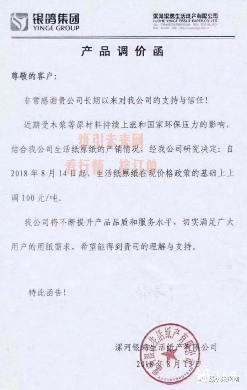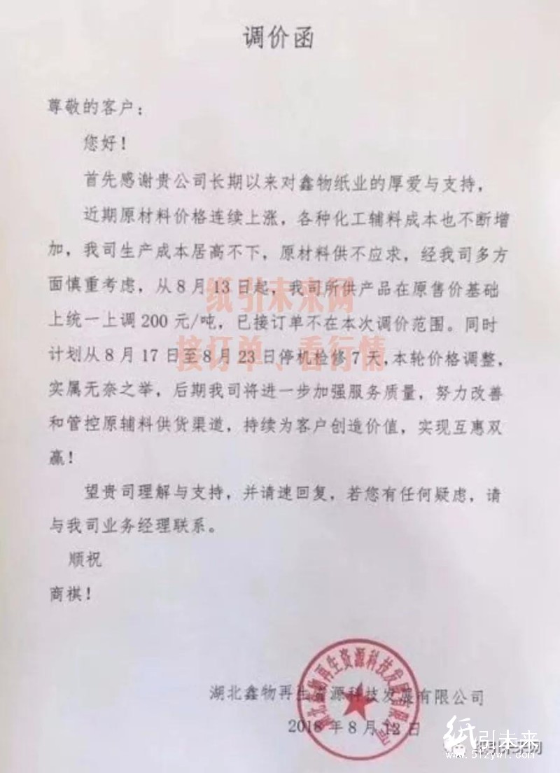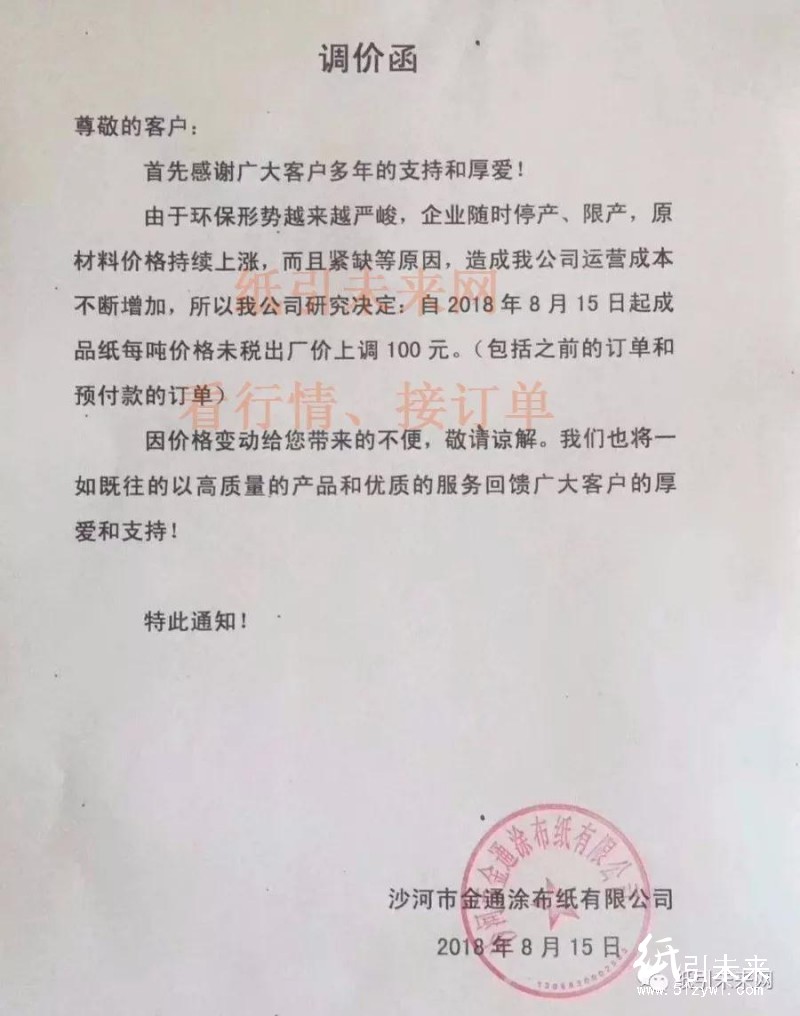 沙河市金通涂布紙有限公司:由于環保形勢越來越嚴峻,企業隨時停產、限產,原材料價格持續上漲,而且緊缺等原因,自2018年8月15日起成品紙每噸價格未稅出廠價上調100元。(包括之前的訂單和預付款的訂單)