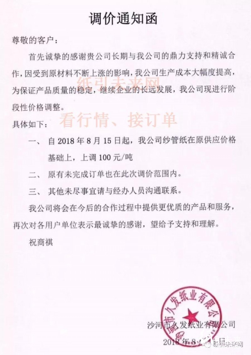 沙河市久發紙業有限公司:由于原材料不斷上漲的影響,自2018年8月15日起,我司紗管紙在原供應價基礎上,上調100元/噸。