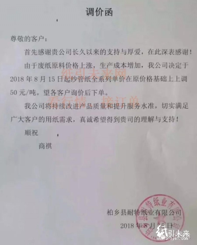 柏鄉縣耐特紙業有限公司:由于廢紙原材料價格上漲,生產成本增加,我公司決定于2018年8月15日起紗管紙全系列單價在原價格基礎上上調50元/噸。