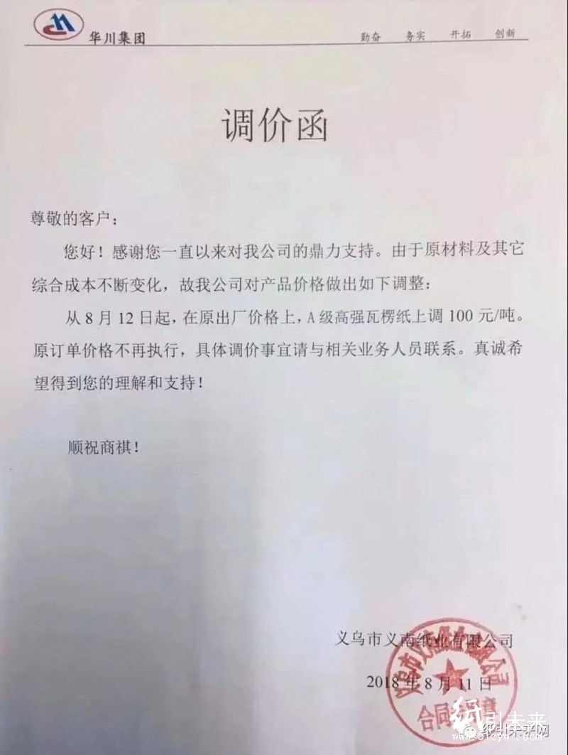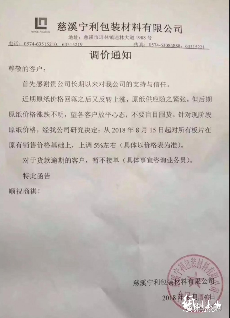 寧波文康包裝制品有限公司:自8月14日18:00起在原有的銷售價格基礎上,上調紙板價格:三層紙板:上調0.2元/雙平方,四層紙板:上調0.3元/雙平方,五層紙板:上調0.3元/雙平方。