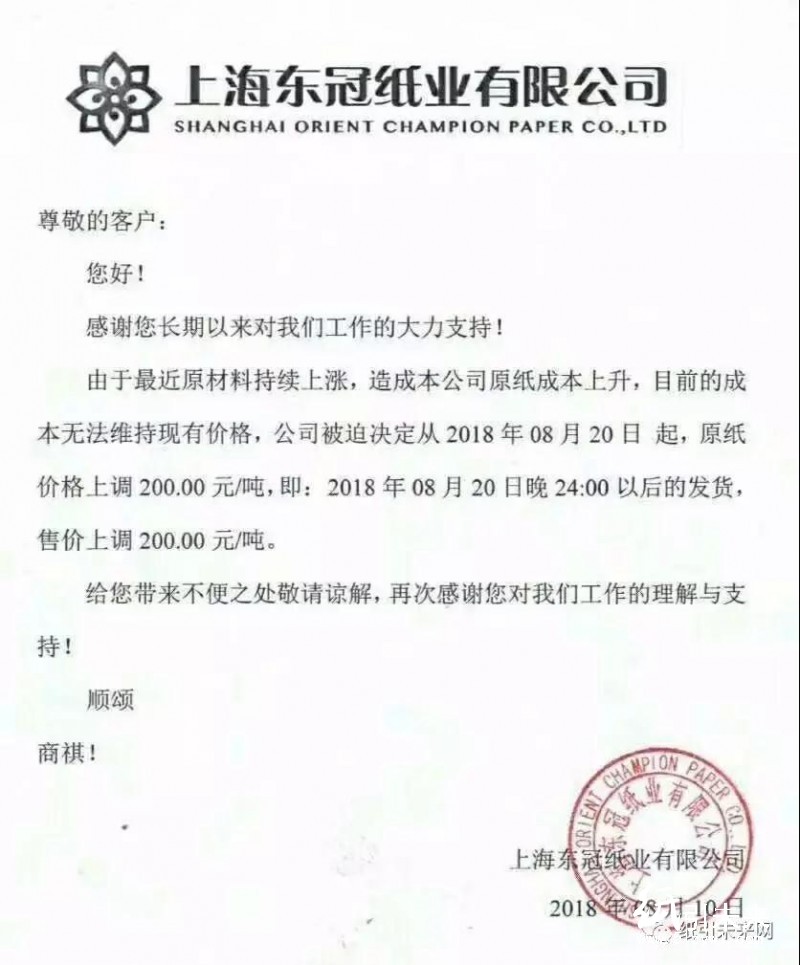 上海東冠紙業有限公司:由于最近原材料持續上漲。從8月20日起,原紙價格上調200元/噸。