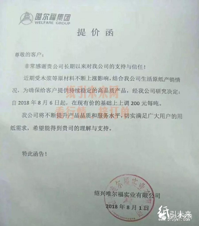 紹興唯爾福實業有限公司:近期受木漿等原材料不斷上漲,自8月6日起 ,在現有價的基礎上上調200元每噸。
