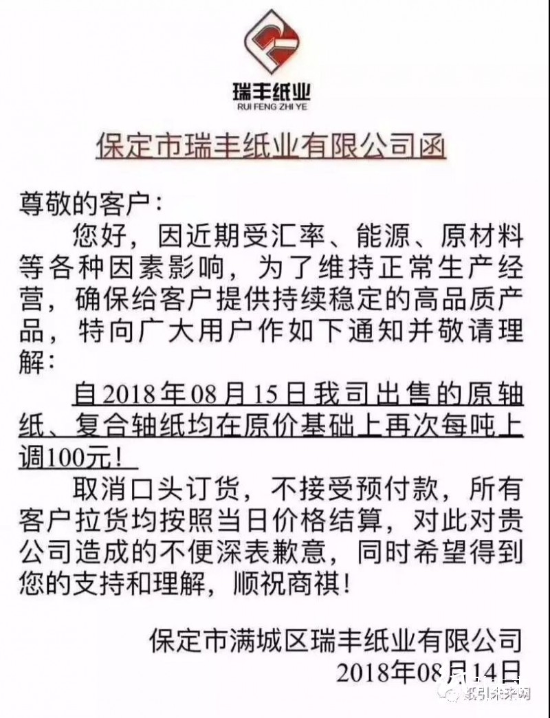 保定市瑞豐紙業有限公司:因近期受匯率、能源、原材料等各種因素影響,自2018年8月15日我司出售的原軸紙、復合軸紙均在原價基礎上再次每噸上調100元。