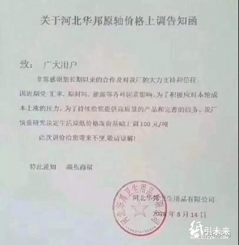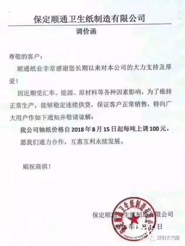 保定市順通衛生紙制造有限公司:因近期受匯率、能源、原材料等各種因素影響,我公司軸紙價格自2018年8月15日起每噸上調100元。
