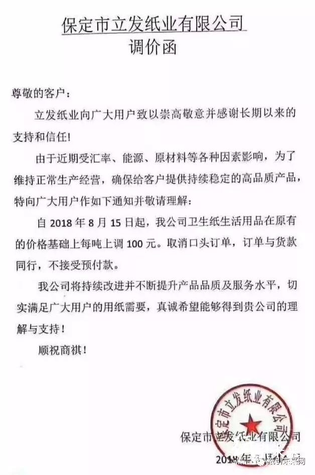 保定市立發紙業有限公司:因近期受匯率、能源、原材料等各種因素影響,我公司衛生紙生活用品在原有的價格基礎每噸上調100元。