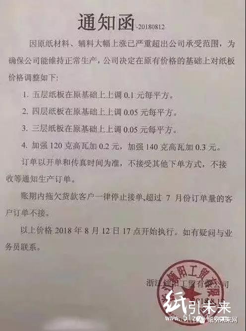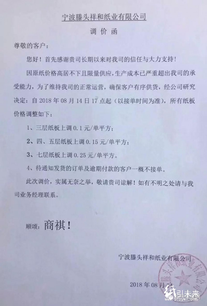 寧波滕頭祥和紙業有限公司:自8月14日17點起(以接單時間為準),三層紙板上調0.1元/單平方,四、五層紙板上調0.15元/單平方,七層紙板上調0.25元/單平方。