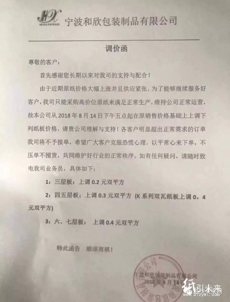 寧波和歌包裝制品有限公司:自8月14日下午五點起在原銷售價格基礎上上調紙板價格:三層紙板:上調0.2元雙平方,四五層紙板:上調0.3元雙平方(K系列雙瓦紙板上調0.4元雙平方),六、七層紙板:上調0.4元雙平方。