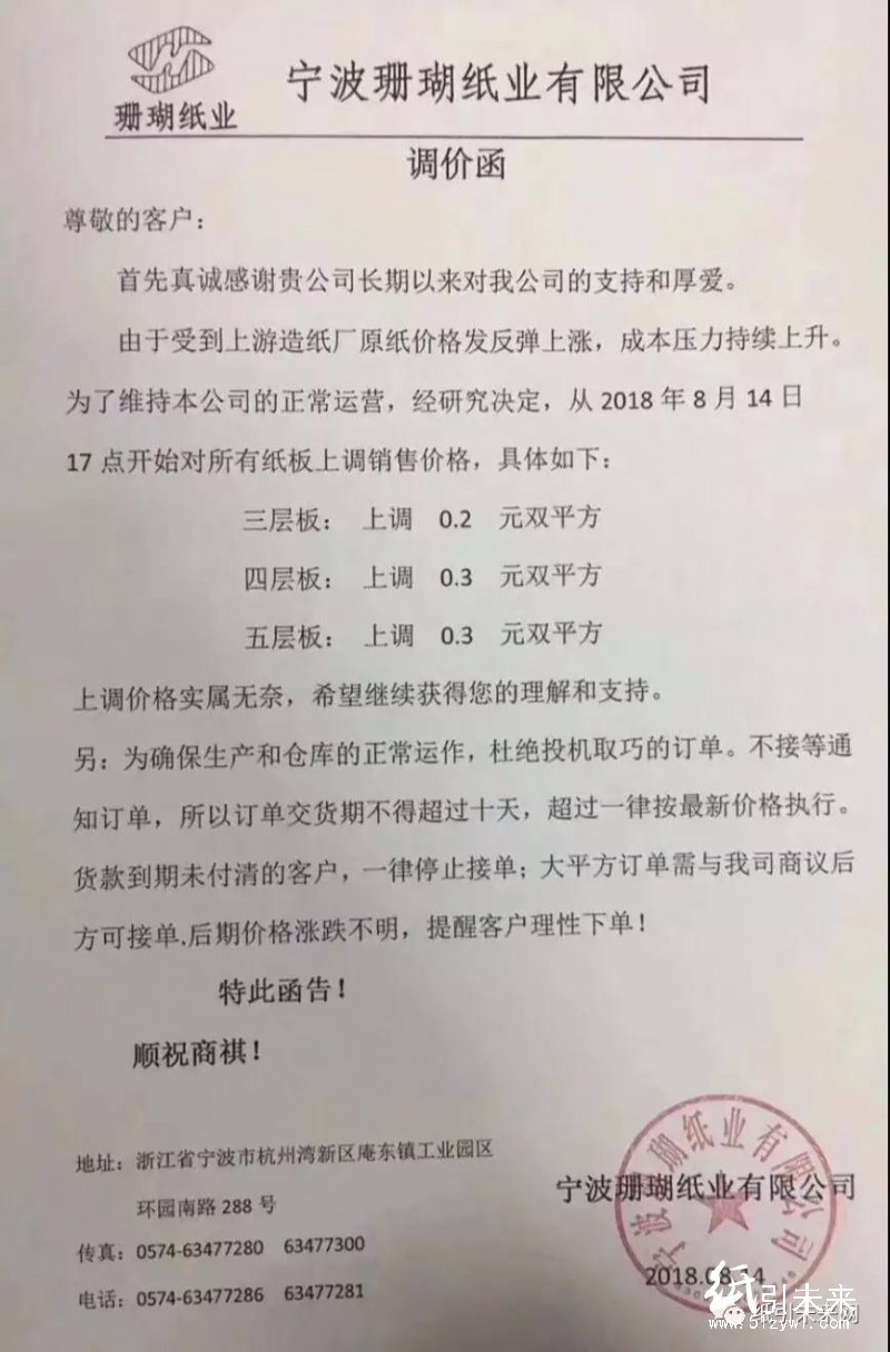 寧波珊瑚紙業有限公司:自8月14日17點開始對所有紙板上調銷售價格:三層紙板:上調0.2元雙平方,四層紙板:上調0.3元雙平方,五層紙板:上調0.3元雙平方