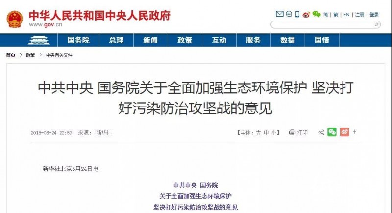 6月24日,中央對于環保再出重磅文件——《中共中央國務院關于全面加強生態環境保護堅決打好污染防治攻堅戰的意見》確定,到2020年,生態環境質量總體改善,主要污染物排放總量大幅減少,環境風險得到有效管控,生態環境保護水平同全面建成小康社會目標相適應。