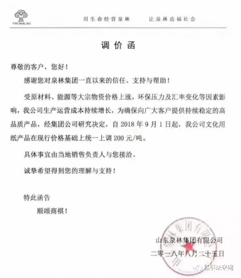 山東泉林集團有限公司:受原材料、能源等大宗物資價格上漲,環(huán)保壓力及匯率變化等因素影響,自9月1日起,我公司文化用紙產(chǎn)品在現(xiàn)行價格基礎(chǔ)上統(tǒng)一上調(diào)200元/噸。