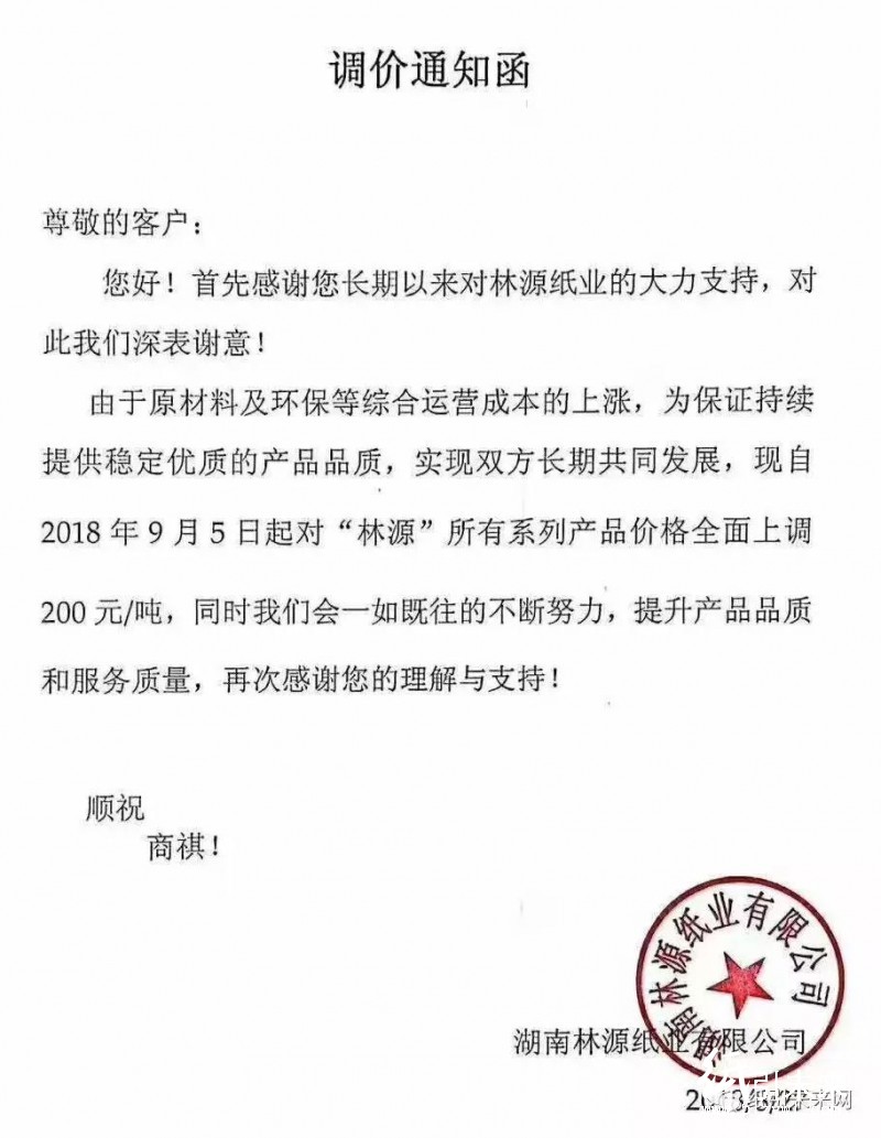 湖南林源紙業(yè)有限公司:由于原材料及環(huán)保等綜合運營成本的上漲,自9月5日起對“林源”所有系列產(chǎn)品價格全面上調(diào)200元/噸。